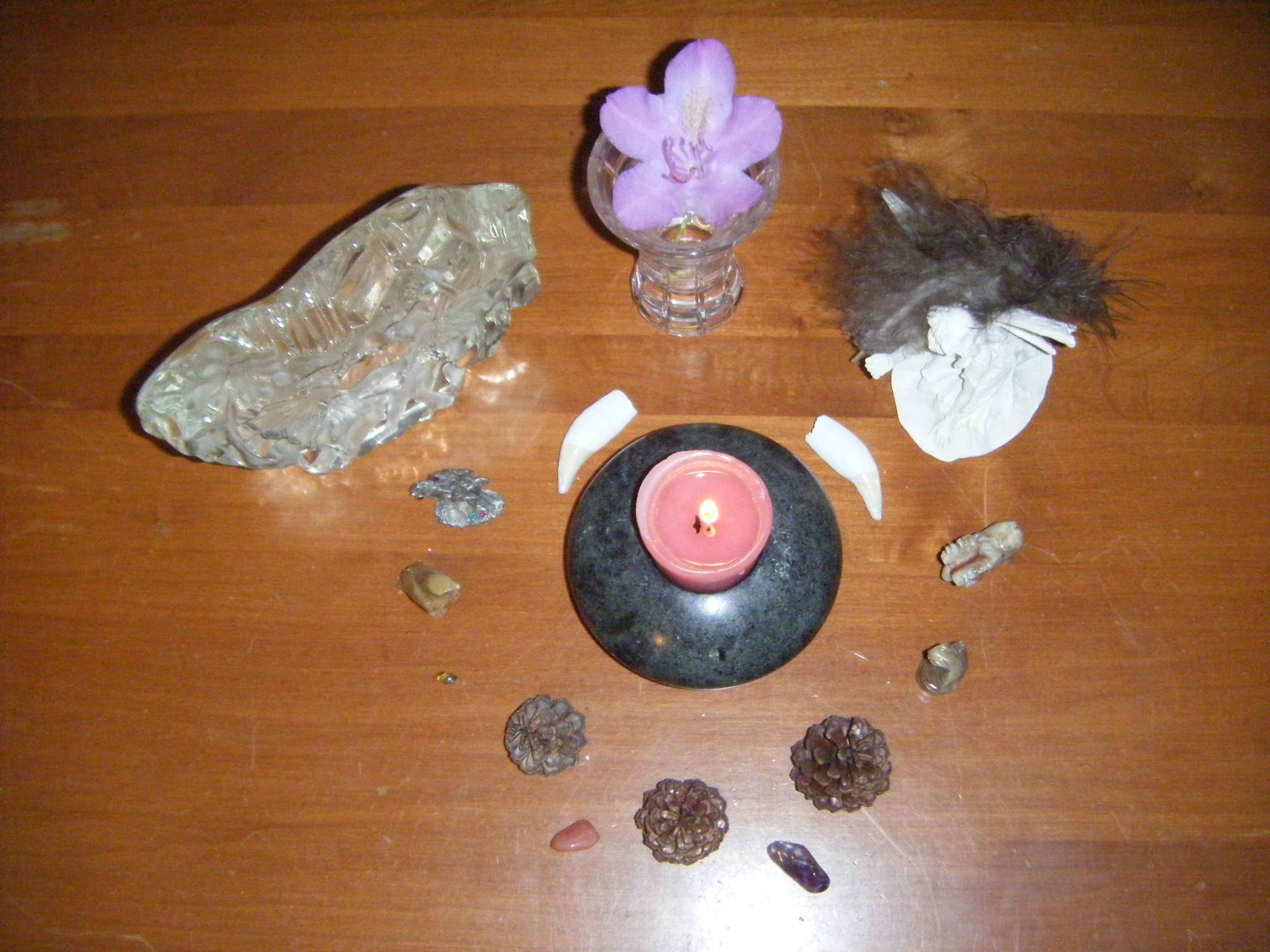 Play soft music if you wish and light a candle on a safe surface in front of you, encircling it with symbols that have a meaningful connection to Earth for you, such as animal totem figurines, crystals, stones, leaves, flowers or feathers.