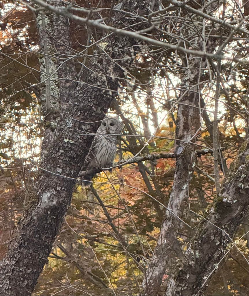 For more than an hour, the owl hunted silently the small woods in my backyard, mostly staying in the same hemlock, and quite frequently peering into my soul window directly through into my eyes.