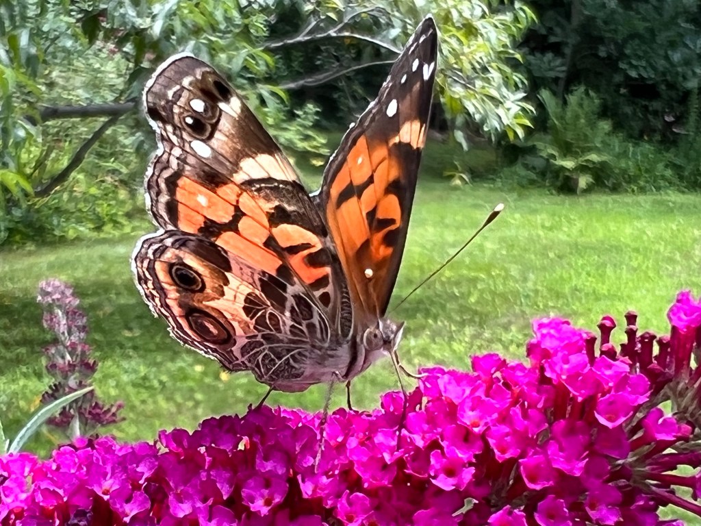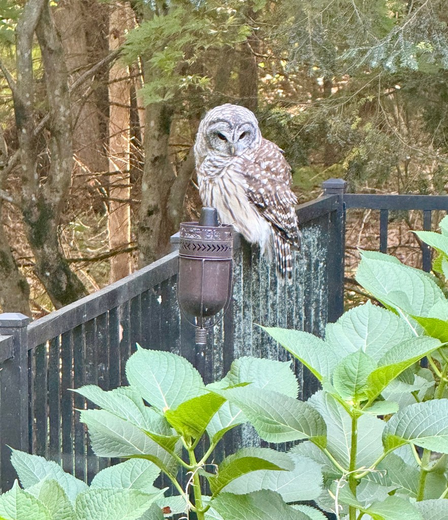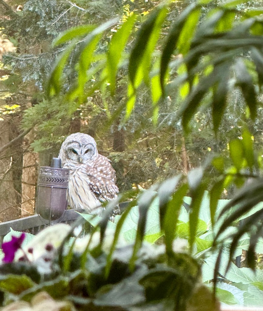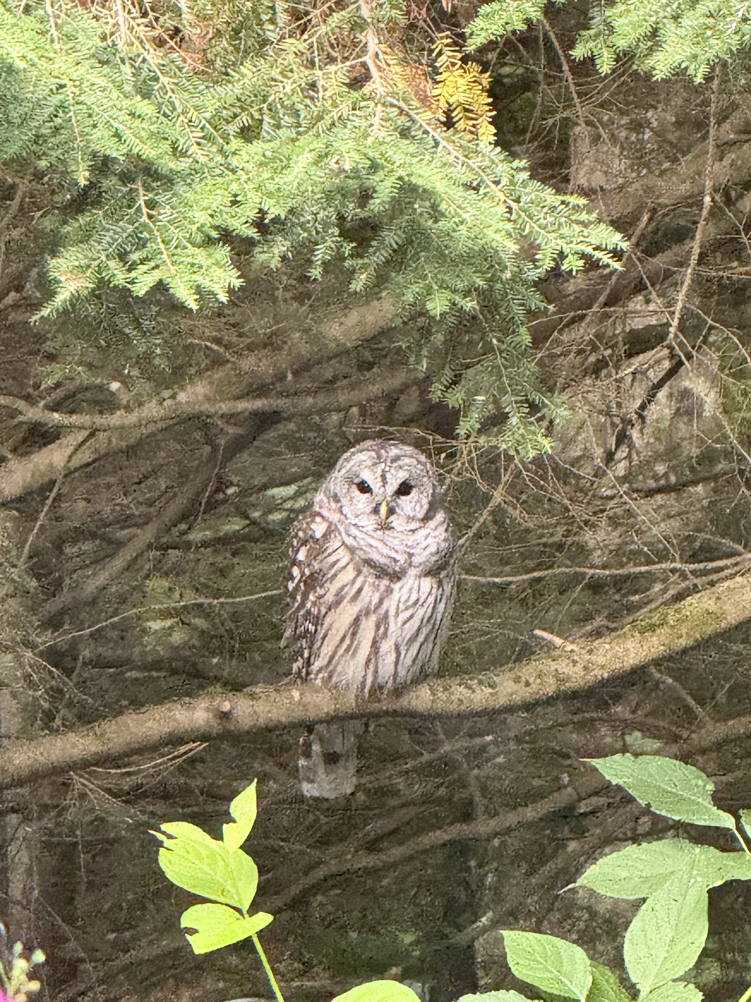 It was not yet 7:00am in the morning, I had reached over to grasp the teapot, about to fill it with water to brew a cup of chaga, when I looked out my kitchen window and saw the owl staring back at me. It was perched on the lowest branch of the hemlock just beyond the far side of the pool, a couple of yards away. An “Oh my god,” or something close to it, escaped from my mouth is I put down the teapot and grabbed the phone.