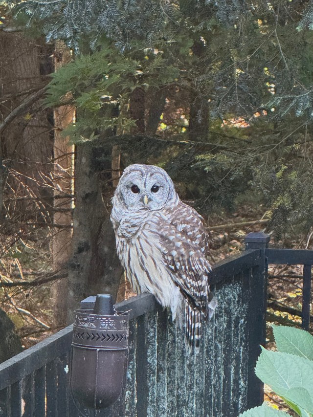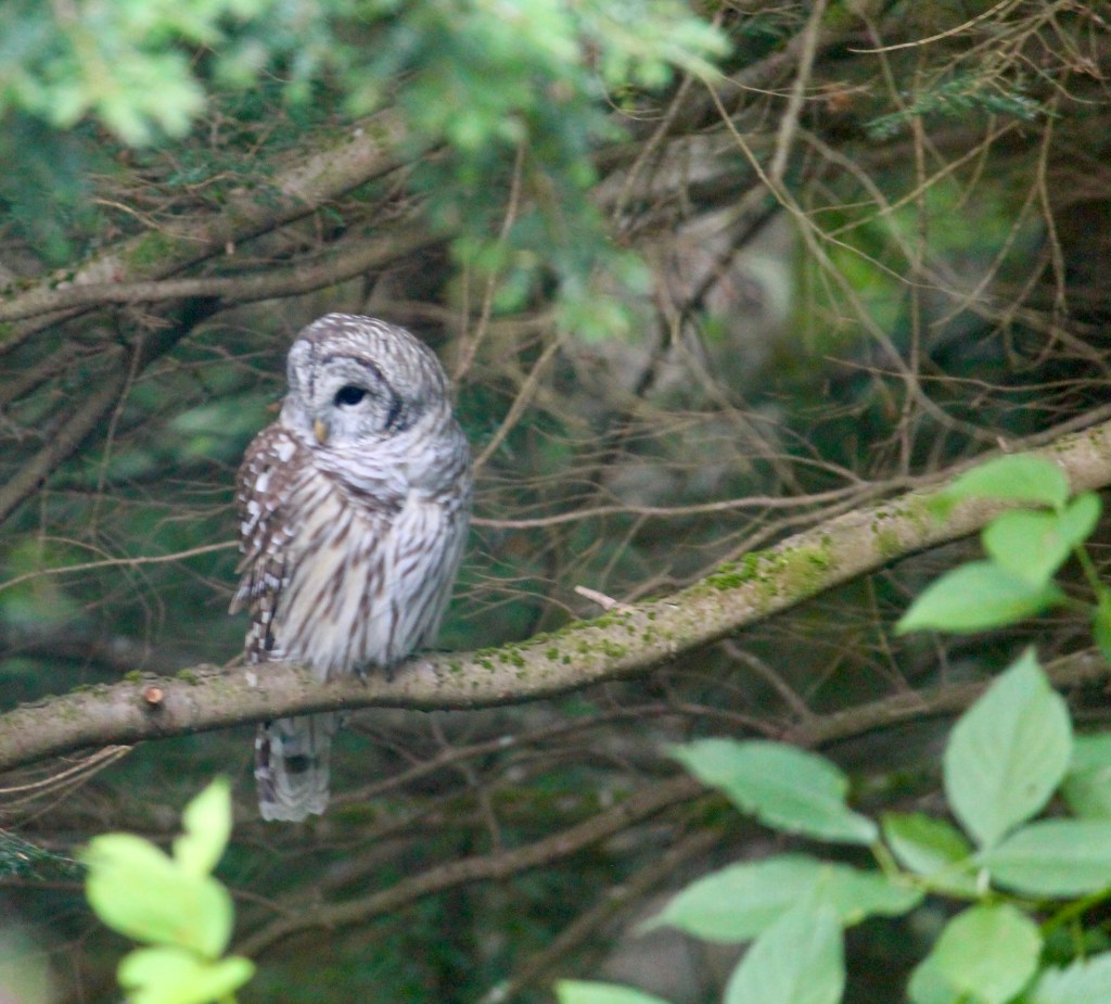 There was no need to panic. The owl had no plans elsewhere, in fact, it was quite content to spend its morning in the copse of hemlocks, peering into my soul window, and occasionally onto the forest floor for a sign of breakfast. Or would that be dinnertime of an owl?